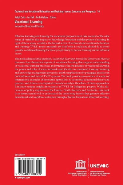 Vocational Learning: Innovative Theory and Practice discusses four theoretical aspects of vocational learning that support understanding of vocational learning processes and practices: the situations of vocational learning; the power and roles of social networks and identity in vocational learning; knowing and knowledge management processes; and the implications for pedagogic practices in both informal and formal TVET systems. The book provides an overview of a series of international examples of innovative approaches to vocational educational theory and practice, and it draws on empirical research to analyze the effects of those approaches. It includes unique insights into aspects of TVET for Indigenous peoples. With a discussion of policy implications for Europe, North America and Australia, this book is an instrumental tool to understand the underlying factors that generate effective educational and workforce outcomes through effective formal and informal learning.