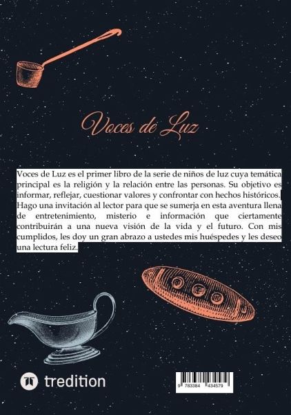 Voces de Luz es el primer libro de la serie de niños de luz cuya temática principal es la religión y la relación entre las personas. Su objetivo es informar, reflejar, cuestionar valores y confrontar con hechos históricos.Hago una invitación al lector para que se sumerja en esta aventura llena de entretenimiento, misterio e información que ciertamente contribuirán a una nueva visión de la vida y el futuro. Con mis cumplidos, les doy un gran abrazo a ustedes mis huéspedes y les deseo una lectura feliz.