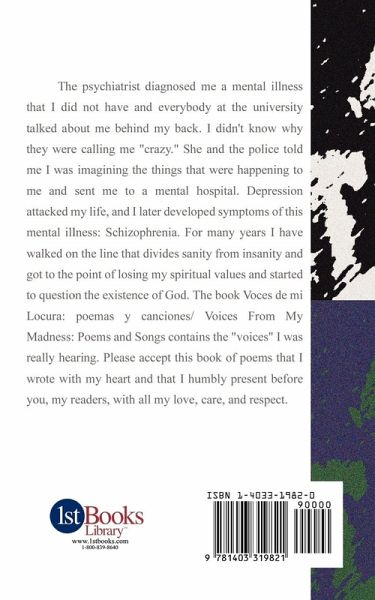 Voces de mi locura: poemas y canciones/ Voices From My Madness: Poems and Songs is a collection of poems that deal with my search to find God and overcome my mental illness. Some poems contain music, internal rhymes, and dialogues or stories in prose that talk about life, love, hope, my dreams and fears, and nature