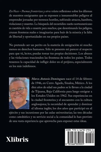 "En Voces - Poemas fronterizos y otros relatos" reflexiono sobre los dilemas de nuestros emigrantes que se exponen a innumerables peligros al emprender jornadas por terrenos hostiles, sufriendo atracos, hambres, violaciones y muertes. La búsqueda del escurridizo sueño norteamericano es cuestión de vida o muerte para muchos, que desestimando los peligros, cruzan fronteras reales e imaginarias para huir de la miseria y la falta de libertad y de todo tipo de oportunidades en sus propios países. No pretendo ser un perito en la materia de emigración ni mucho menos en derechos humanos. Sólo te presento mi parecer al respecto para que tú, lector, puedas tomar tus propias decisiones. Los abusos y las violaciones trascienden las fronteras de todos los países. Todos tenemos la capacidad de infligir dolor en el prójimo, especialmente en los más indefensos.
