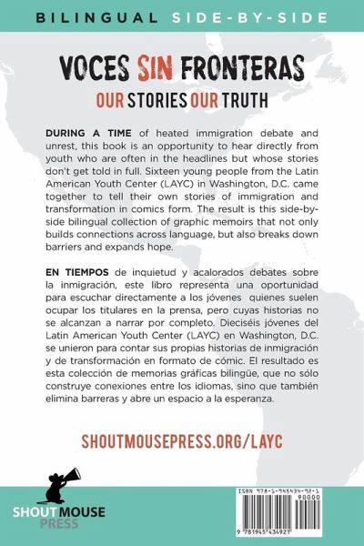 NEW EDITION with a Foreword by award-winning author Meg Medina. During a time of heated immigration debate and unrest, this book is an opportunity to hear directly from youth who are often in the headlines but whose stories don’t get told in full. Sixteen young people from the Latin American Youth Center (LAYC) in Washington, D.C. came together to tell their own stories of immigration and transformation in comics form. The result is this side-by-side bilingual collection of graphic memoirs that not only builds connections across language, but also breaks down barriers and expands hope. The authors of this collection are members of the Latino Youth Leadership Council of the Latin American Youth Center in Washington, DC. This group of teen immigrants from Central America and the Caribbean are dedicated to promoting cross-cultural understanding and social justice in their community. The book was produced through a collaboration with Shout Mouse Press, a nonprofit writing program and publishing house for unheard voices. Learn more at shoutmousepress.org *** En tiempos de inquietud y acalorados debates sobre la inmigración, este libro representa una oportunidad para escuchar directamente a los jóvenes quienes suelen ocupar los titulares en la prensa, pero cuyas historias no se alcanzan a narrar por completo. Dieciséis jóvenes del Latin American Youth Center (LAYC) en Washington, D.C. se unieron para contar sus propias historias de inmigración y de transformación en formato de cómic. El resultado es esta colección de memorias gráficas bilingüe, que no sólo construye conexiones entre los idiomas, sino que también elimina barreras y abre un espacio a la esperanza.