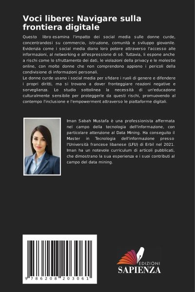 Questo libro esamina l'impatto dei social media sulle donne curde, concentrandosi su commercio, istruzione, comunità e sviluppo giovanile. Evidenzia come i social media diano loro potere attraverso l'accesso alle informazioni, al networking e all'espressione di sé. Tuttavia, li espone anche a rischi come lo sfruttamento dei dati, le violazioni della privacy e le molestie online, con molte donne che non comprendono appieno i pericoli della condivisione di informazioni personali.Le donne curde usano i social media per sfidare i ruoli di genere e difendere i propri diritti, ma si trovano a dover fronteggiare reazioni negative e sorveglianza. Lo studio sottolinea la necessità di un'educazione culturalmente sensibile per proteggerle da questi rischi, promuovendo al contempo l'inclusione e l'empowerment attraverso le piattaforme digitali.