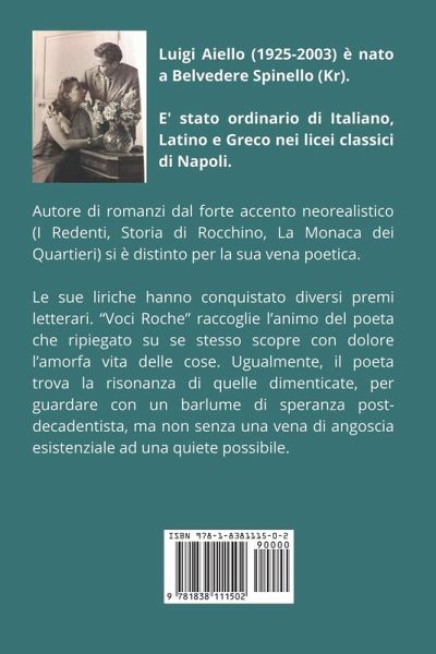 Luigi Aiello (1925-2003) è nato a Belvedere Spinello (Kr). E' stato ordinario di Italiano, Latino e Greco nei licei classici di Napoli. Autore di romanzi dal forte accento neorealistico (I Redenti, Storia di Rocchino, La Monaca dei Quartieri) si è distinto per la sua vena poetica. Le sue liriche hanno conquistato diversi premi letterari. "Voci Roche" raccoglie l'animo del poeta che ripiegato su se stesso scopre con dolore l'amorfa vita delle cose. Ugualemente, il poeta trova la risonanza di quelle dimenticate, per guardare con un barlume di speranza post-decadentista, ma non senza una vena di angoscia esistenziale ad una quiete possibile.