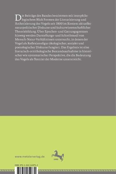 Die Beiträge des Bandes bestimmen mit interphilologischem Blick Formen der Literarisierung und Asthetisierung des Vogels seit 1800 im Kontext aktueller naturpolitischer Diskurse und kulturwissenschaftlicher Theoriebildung. Über Epochen- und Gattungsgrenzen hinweg werden Darstellungs- und Schreibmodi von Mensch-Natur-Verhältnissen untersucht, in denen der Vogel als Reflexionsfigur ökologischer, sozialer und poetologischer Diskurse fungiert. Das Ergebnis ist eine literarisch-ornithologische Bestandsaufnahme in historischer wie systematischer Perspektive, die die Bedeutung des Vogels als Texttier der Moderne unterstreicht.