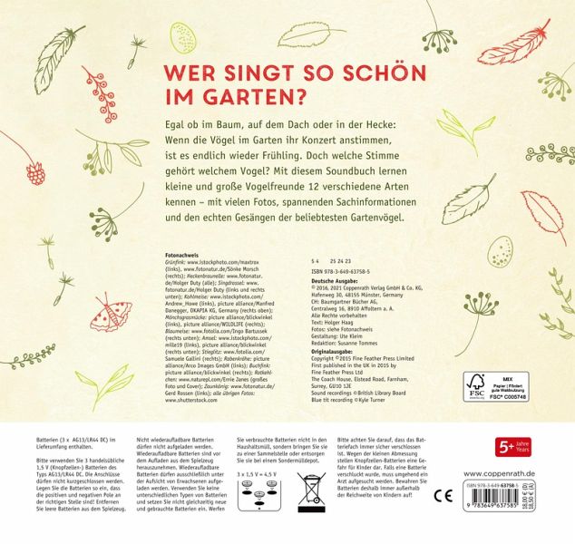 Ob im Baum, auf dem Dach oder in der Hecke: Im Frühling stimmen die Vögel ihr großes Konzert an. Doch welche Stimme gehört welchem Vogel? Mit diesem opulenten Soundbuch kommen kleine und große Vogelfreunde 12 verschiedenen Arten auf die Spur - mit vielen Fotos, spannenden Sachinformationen und den echten Gesängen unserer beliebtesten Gartenvögel.