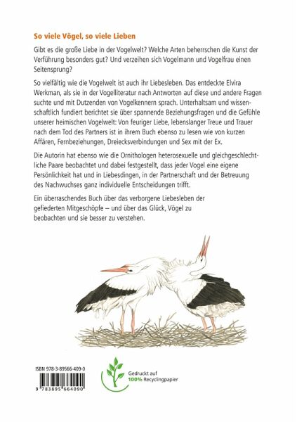 So vielfältig wie die Vogelwelt, ist auch ihr Liebesleben, entdeckte Elvira Werkman, als sie in die Vogelliteratur tauchte und mit Dutzenden von Vogelkennern sprach. Von feuriger Liebe, lebenslanger Treue und Trauer nach dem Tod des Partners ist in ihrem Buch ebenso zu lesen wie von kurzen Affären, Fernbeziehungen, Dreiecksverbindungen und Sex mit der Ex. Die Autorin hat gemeinsam mit den Ornithologen heterosexuelle und gleichgeschlechtliche Paare beobachtet und dabei festgestellt, dass jeder Vogel eine eigene Persönlichkeit hat und in Liebesdingen ganz individuelle Entscheidungen trifft.