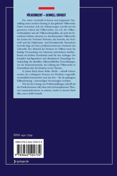 Der Autor vermittelt in kurzer und prägnanter Darstellung einen raschen Einstieg in das geltende Völkerrecht. Dabei erstrecken sich die Erläuterungen sowohl auf die gemeinen Lehren des Völkerrechts, wie z.B. die Völkerrechtssubjekte und die Völkerrechtsquellen, als auch die besonderen Gebiete, darunter u.a. das humanitäre Völkerrecht, das System der Vereinten Nationen, das Seerecht, das Strafrecht und das Diplomaten- und Konsularrecht. Besonderes Gewicht liegt auf dem problemorientierten Zuschnitt des Lehrstoffs. Der Abdruck der Normen im Volltext sowie die häufige Verwendung von Schemata unterstützen darüberhinaus ein leichtes Verständnis auch für den Anfänger. Die komplett durchgesehene und aktualisierte Neuauflage berücksichtigt die aktuellen völkerrechtlichen Entwicklungen, wie die Staatenimmunität, die Geltung des Völkerrechts in Deutschland oder die Situation in der Ukraine.