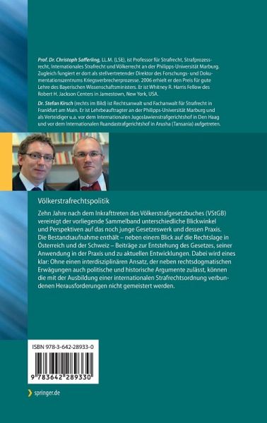 Sabine Leutheusser-Schnarrenberger, Vorwort.- Christoph Safferling und Stefan Kirsch, Einleitung.- Eckart Conze, Die Bedeutung Nürnbergs für dasVölkerstrafrecht in Deutschland.- Manfred Görtemaker, Die "Wende" in Deutschland und die "Völkerstrafrechtspolitik".- Hans-Peter Kaul, Der Beitrag Deutschlands zum Völkerstrafrecht.- Thorsten Bonacker, Verfolgung von Völkerstraftaten in Deutschland und Transitional Justice.- Gabriela Mischkowski, Die andere Sicht "zur Sache". Elvire aus Süd-Kivu und das deutsche Völkerstrafgesetzbuch.- Klaus Günther und Vasco Reuss, Die Legitimation von Völkerstrafrecht in Deutschland.- Thomas Jäger, Völkerstrafrecht und humanitäres Völkerrecht.- Dieter Magsam, Die Opfer in völkerstrafrechtlichen Prozessen in Deutschland.- Thomas Dittmann, Das Völkerstrafgesetzbuch und das BMJ.- Natalie v. Wistinghausen, Strafverteidigung in Völkerstrafsachen in Deutschland.- Jürgen Stock, Polizeiliche Ermittlungen im Ausland.- Christian Ritscher, Ermittlungstätigkeiten desGeneralbundesanwalts.- Jürgen Schäfer, Rechtsprechung des BGH.- Stephan Weber, VStGB und die Bundeswehr.- Klaus Rackwitz, Deutschland und der IStGH in Kooperation.- Ewald Brandt, Piraterie-Verfahren in Deutschland.- Kai Ambos, Neue Tatbestände im VStGB.- Elisa Hoven, Der Tatbestand der Aggression.- Hilde Farthofer, Die Verfolgung von Völkerstraftaten in Österreich.- Elisabeth Baumgartner, Die Verfolgung von Völkerstraftaten in der Schweiz.- Monika Böhm und Viola Teubert, Das Völkerstrafgesetzbuch und das Grundgesetz.- Florian Hansen, Prozessbeobachtung in Deutschland.