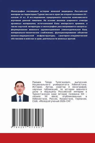 Monografiq poswqschena istorii woennoj mediciny Rossijskoj imperii na territorii Turkestanskogo kraq (wo wtoroj polowine XIX - nachale XX w.). V issledowanii predprinqta popytka komplexnogo izucheniq dannoj tematiki. Na osnowe analiza shirokogo spektra arhiwnyh materialow, istochnikowoj bazy imperskogo wremeni, a takzhe nauchnoj literatury w monografii rassmatriwaütsq woprosy: formirowaniq woennogo zdrawoohraneniq (zakonodatel'naq baza, material'no-tehnicheskoe snabzhenie), funkcionirowaniq ob#ektow woenno-medicinskoj infrastruktury, sanitarno-äpidemicheskoj obstanowki w wojskah i krae, deqtel'nosti woennyh wrachej.