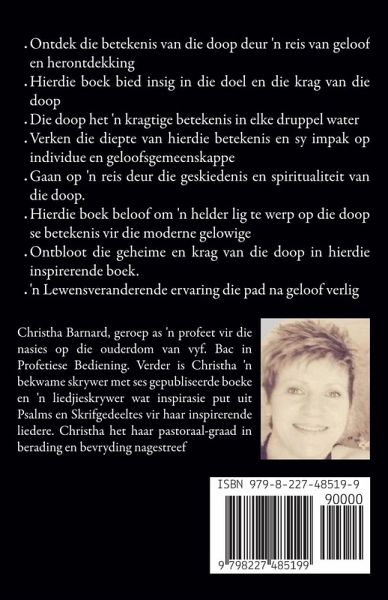 Ontdek die betekenis van die doop deur 'n reis van geloof en herontdekking Hierdie boek bied insig in die doel en die krag van die doop Die doop het 'n kragtige betekenis in elke druppel water Verken die diepte van hierdie betekenis en sy impak op individue en geloofsgemeenskappe Gaan op 'n reis deur die geskiedenis en spiritualiteit van die doop. Hierdie boek beloof om 'n helder lig te werp op die doop se betekenis vir die moderne gelowige Ontbloot die geheime en krag van die doop in hierdie inspirerende boek. 'n Lewensveranderende ervaring die pad na geloof verlig