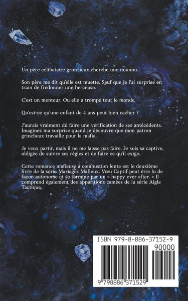 Un père célibataire grincheux cherche une nounou... Son père me dit qu'elle est muette. Sauf que je l'ai surprise en train de fredonner une berceuse. C'est un menteur. Ou elle a trompé tout le monde. Qu'est-ce qu'une enfant de 4 ans peut bien cacher ? J'aurais vraiment dû faire une vérification de ses antécédents. Imaginez ma surprise quand je découvre que mon patron grincheux travaille pour la mafia. Je veux partir, mais il ne me laisse pas faire. Je suis sa captive, obligée de suivre ses règles et de faire ce qu'il exige. Cette romance mafieuse à combustion lente est le deuxième livre de la série Mariages Mafieux. Vœu Captif peut être lu de façon autonome et se termine par un « happy ever after. » Il comprend également des apparitions camées de la série Aigle Tactique.