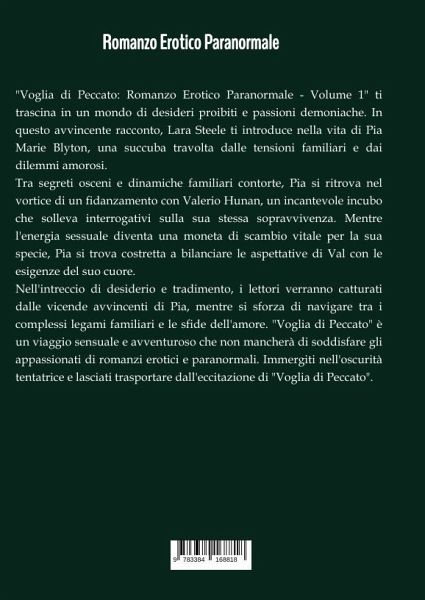 "Voglia di Peccato: Romanzo Erotico Paranormale - Volume 1" ti trascina in un mondo di desideri proibiti e passioni demoniache. In questo avvincente racconto, Lara Steele ti introduce nella vita di Pia Marie Blyton, una succuba travolta dalle tensioni familiari e dai dilemmi amorosi.Tra segreti osceni e dinamiche familiari contorte, Pia si ritrova nel vortice di un fidanzamento con Valerio Hunan, un incantevole incubo che solleva interrogativi sulla sua stessa sopravvivenza. Mentre l'energia sessuale diventa una moneta di scambio vitale per la sua specie, Pia si trova costretta a bilanciare le aspettative di Val con le esigenze del suo cuore.Nell'intreccio di desiderio e tradimento, i lettori verranno catturati dalle vicende avvincenti di Pia, mentre si sforza di navigare tra i complessi legami familiari e le sfide dell'amore. "Voglia di Peccato" è un viaggio sensuale e avventuroso che non mancherà di soddisfare gli appassionati di romanzi erotici e paranormali. Immergiti nell'oscurità tentatrice e lasciati trasportare dall'eccitazione di "Voglia di Peccato".