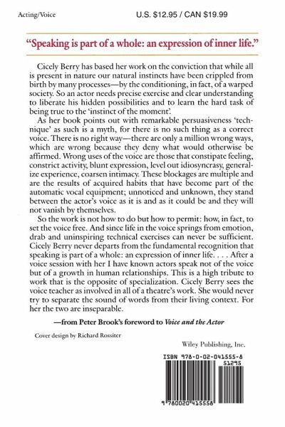 " Speaking is part of a whole: an expression of inner life." Cicely Berry has based her work on the conviction that while all is present in nature our natural instincts have been crippled from birth by many processes by the conditioning, in fact, of a warped society. So an actor needs precise exercise and clear understanding to liberate his hidden possibilities and to learn the hard task of being true to the instinct of the moment . As her book points out with remarkable persuasiveness technique as such is a myth, for there is no such thing as a correct voice. There is no right way there are only a million wrong ways, which are wrong because they deny what would otherwise be affirmed. Wrong uses of the voice are those that constipate feeling, constrict activity, blunt expression, level out idiosyncrasy, generalize experience, coarsen intimacy. These blockages are multiple and are the results of acquired habits that have become part of the automatic vocal equipment; unnoticed and unknown, they stand between the actor' s voice as it is and as it could be and they will not vanish by themselves. So the work is not how to do but how to permit: how, in fact, to set the voice free. And since life in the voice springs from emotion, drab and uninspiring technical exercises can never be sufficient. Cicely Berry never departs from the fundamental recognition that speaking is part of a whole: an expression of inner life