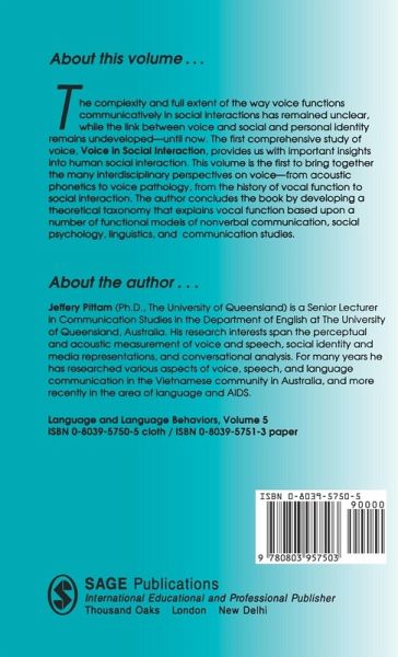 The study of voice provides us with important insights into human social interaction. This volume brings together the many interdisciplinary perspectives on voice - from acoustic phonetics to voice pathology, from the history of vocal function to social psychology - and defines them within the context of social interaction. The author also develops a theoretical taxonomy that explains vocal function based on a number of functional models of nonverbal communication, social psychology, linguistics and communication studies.