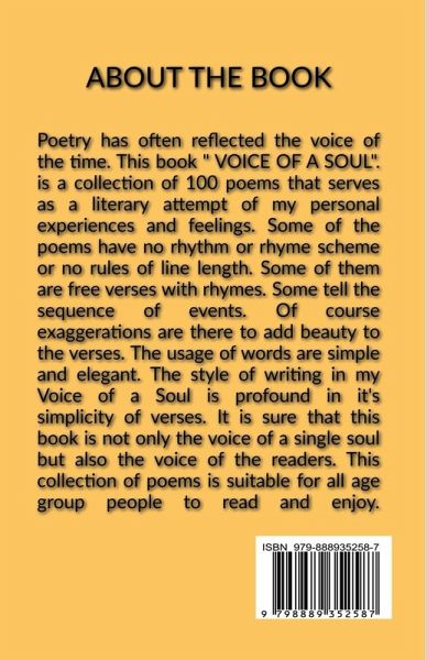 "Voice of a Soul" is a collection of 100 poems that serves as a literary attempt of the author's personal experiences and feelings. The usage of words are simple and elegant. The style of writing in "Voice of a Soul" is profiund in it's simplicity of verses. It is sure that this book is not only the voice of a single soul but also the voice of the readers. The author assures that this collection of poems is suitable for people of all age groups to read and enjoy.