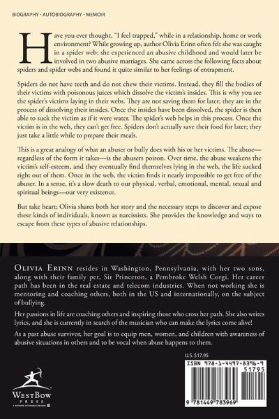 Have you ever thought, "I feel trapped," while in a relationship, home or work environment? While growing up, author Olivia Erinn often felt she was caught in a spider web; she experienced an abusive childhood and would later be involved in two abusive marriages. She came across the following facts about spiders and spider webs and found it quite similar to her feelings of entrapment. Spiders do not have teeth and do not chew their victims. Instead, they fill the bodies of their victims with poisonous juices which dissolve the victim’s insides. This is why you see the spider’s victims laying in their webs. They are not saving them for later; they are in the process of dissolving their insides. Once the insides have been dissolved, the spider is then able to suck the victim as if it were water. The spider’s web helps in this process. Once the victim is in the web, they can’t get free. Spiders don’t actually save their food for later; they just take a little while to prepare their meals. This is a great analogy of what an abuser or bully does with his or her victims. The abuse—regardless of the form it takes—is the abusers poison. Over time, the abuse weakens the victim’s self-esteem, and they eventually find themselves lying in the web, the life sucked right out of them. Once in the web, the victim finds it nearly impossible to get free of the abuser. In a sense, it’s a slow death to our physical, verbal, emotional, mental, sexual and spiritual beings—our very existence. But take heart; Olivia shares both her story and the necessary steps to discover and expose these kinds of individuals, known as narcissists. She provides the knowledge and ways to escape from these types of abusive relationships.