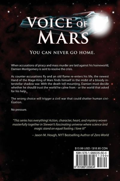 YOU CAN NEVER GO HOME When accusations of piracy and mass murder are laid against his homeworld, Damien Montgomery is sent to resolve the crisis. As counter-accusations fly and an old flame re-enters his life, the newest Hand of the Mage-King of Mars finds himself in the midst of a bloody interstellar shadow war. With the death toll mounting, Damien must decide whether he should trust the world he came from – or the world that asked for his help. The wrong choice will trigger a civil war that could shatter human civilization. No pressure. Voice of Mars is book 3 of the Starship’s Mage series.
