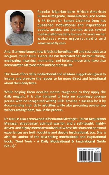 Popular Nigerian-born African-American Business Magnate, Humanitarian, and Media & PR Expert Dr. Sandra Chidinma Duru has published motivational and inspirational quotes, articles, and journals across several media platforms daily for over 22 years on her websites: www.mgbeke.media and www.wenetly.com. And, if anyone knows how it feels to be written off and cast aside as a no-good, it is Dr. Duru. Hence she has dedicated her life to nurturing, motivating, inspiring, mentoring, and helping those who have also been written off to do more and be more in life. Voice of Nature - My Life & Daily Chronicles is designed to help you accomplish a couple of major goals this year, but the most important aim of this project is to draw your attention inwards first of all, before you now relaunch yourself at your objectives daily this year. The voice of nature is within and all around you, and if you listen deep and well enough, you will be amazed at how much motivation, inspiration, drive, and power you've always had within you to pursue, overtake, and conquer all your dreams! This book offers daily motivational and wisdom nuggets designed to inspire and provoke the reader to be more direct and intentional about their daily lives. While helping them develop mental toughness as they apply the daily nuggets, it is also designed to help any seemingly average person with no recognized writing skills develop a passion for it by documenting their daily activities while also grooming several top writers among them, too, in the process. Dr. Duru is also a renowned Information Strategist, Talent Acquisition Manager, street-smart spiritual warrior, and a self-taught, highly-driven, and highly motivated individual whose life story and personal experiences are both touching and deeply inspirational, too.