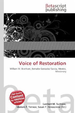 Please note that the content of this book primarily consists of articles available from Wikipedia or other free sources online. The Voice of Restoration is a missionary organization that promotes the teachings of William M. Branham to largely Spanish speaking countries. It was founded in 1987 by Bernabe Gonzalez Garcia. Annually it hosts or sponsors over fifteen conventions or special meetings predominantly in the United States and Mexico. Its annual international convention takes place in Phoenix, AZ during the Thanksgiving holidays in November with cooperating ministries from all over North, Central, and South America attending.