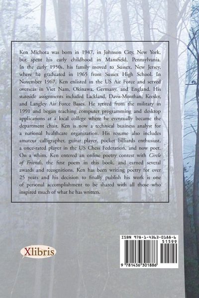 Ken Michota was born in 1947, in Johnson City, New York, but spent his early childhood in Mansfield, Pennsylvania. In the early 1950s, his family moved to Sussex, New Jersey, where he graduated in 1965 from Sussex High School. In November 1967, Ken enlisted in the US Air Force and served overseas in Viet Nam, Okinawa, Germany, and England. His stateside assignments included Lackland, Davis-Monthan, Keesler, and Langley Air Force Bases. He retired from the military in 1991 and began teaching computer programming and desktop applications at a local college where he eventually became the department chair. Ken is now a technical business analyst for a national healthcare organization. His resume also includes amateur calligrapher, guitar player, pocket billiards enthusiast, a once-rated player in the US Chess Federation, and now poet. On a whim, Ken entered an online poetry contest with Circle of Friends, the first poem in this book, and earned several awards and recognitions. Ken has been writing poetry for over 25 years and his decision to finally publish his work is one of personal accomplishment to be shared with all those who inspired much of what he has written.