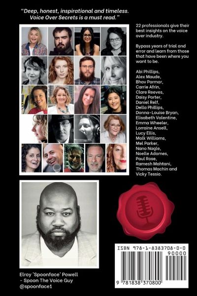 Are you here because you've been told you have a 'great voice'? Are you pivoting, just starting out or have you been in the industry for a while and hit a wall? Are you feeling a little lost, isolated or struggling with consistency? You're in the right place. Honest sharings from behind the scenes about the ups, downs and in-betweens. 22 professionals give their best insights on the voice over industry. Bypass years of trial and error and learn from those that have been where you want to be. "Deep, honest, inspirational and timeless. Voice Over Secrets is a must read." Editor: Elroy 'Spoonface' Powell Spoon The Voice Guy @spoonface1 Number 1 Selling Artist, the voice of Switch Guarantee with appearances in Jingle Jangle, Fighting With My Family and more. Contributors: Abi Phillips, Alex Maude, Bhav Parmar, Carrie Afrin, Clare Reeves,Daisy Porter, Daniel Relf, Della Phillips, Donna-Louise Bryan, Elisabeth Valentine, Emma Wheeler, Lorraine Ansell, Lucy Ellis, Malk Williams, Mel Parker, Nano Nagle, Noelle Adames, Paul Rose, Ramesh Mahtani, Thomas Machin, Vicky Tessio and Elroy 'Spoonface' Powell (Editor).