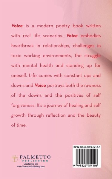 Voice is a modern poetry book written with real life scenarios. Voice embodies heartbreak in relationships, challenges in toxic working environments, the struggle with mental health and standing up for oneself. Life comes with constant ups and downs and Voice portrays both the rawness of the downs and the positives of self forgiveness. It's a journey of healing and self growth through reflection and the beauty of time.