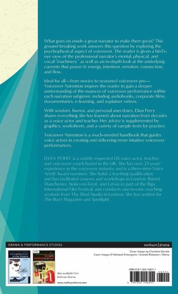 What goes on inside a great narrator to make them great? This ground-breaking work answers this question by exploring the psychophysical aspect of voiceover. The reader is given a bird's-eye view of the professional narrator's mental, physical, and vocal "machinery" as well as an in-depth look at the underlying currents that power it: energy, intention, emotion, connection, and flow. Ideal for all-from novice to seasoned voiceover pro-Voiceover Narration inspires the reader to gain a deeper understanding of the nuances of voiceover performance within each narration subgenre, including audiobooks, corporate films, documentaries, e-learning, and explainer videos. With wisdom, humor, and personal anecdotes, Dian Perry shares everything she has learned about narration from decades as a voice actor and teacher. Her advice is supplemented by graphics, worksheets, and a variety of sample text for practice. Voiceover Narration is a much-needed handbook that guides voice actors in creating and delivering more intuitive voiceover performances.