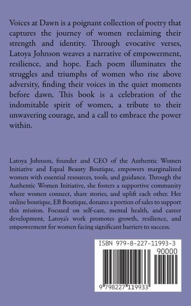 Voices at Dawn is a poignant collection of poetry that captures the journey of women reclaiming their strength and identity. Through evocative verses, Latoya Johnson weaves a narrative of empowerment, resilience, and hope. Each poem illuminates the struggles and triumphs of women who rise above adversity, finding their voices in the quiet moments before dawn. This book is a celebration of the indomitable spirit of women, a tribute to their unwavering courage, and a call to embrace the power within.
