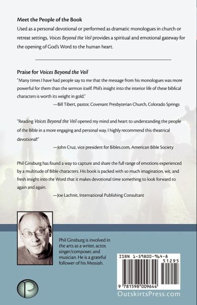 Meet the People of the Book Used as a personal devotional or performed as dramatic monologues in church or retreat settings, Voices Beyond the Veil provides a spiritual and emotional gateway for the opening of God's Word to the human heart. Praise for VOICES BEYOND THE VEIL ------------------------------------------------------ "Many times I have had people say to me that the message from his monologues was more powerful for them than the sermon itself. Phil's insight into the interior life of these biblical characters is worth its weight in gold." -Bill Tibert, pastor, Covenant Presbyterian Church, Colorado Springs "Reading Voices Beyond the Veil opened my mind and heart to understanding the people of the Bible in a more engaging and personal way. I highly recommend this theatrical devotional!" -John Cruz, vice president for Bibles.com, American Bible Society Phil Ginsburg has found a way to capture and share the full range of emotions experienced by a multitude of Bible characters. His book is packed with so much imagination, wit and fresh insight into the Word that it makes devotional time something to look forward to again and again, ------- -Joe Lachnit, International Publishing Consultant Phil Ginsburg is involved in the arts as a writer, actor, singer/composer, and musician. He is a grateful follower of his Messiah.