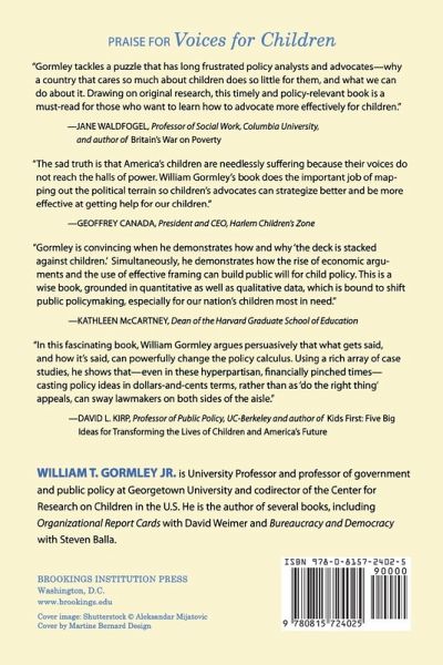 " The United States spends more on programs for the elderly than it does on programs that enhance child development and improve child welfare. Why has public policy neglected the development phase of young Americans' lives not only in substantive dollars spent, but also in program design and implementation? Noted child care and education policy expert William Gormley highlights the portrayal of children's issues in both the mass media and in public policymaking to explain why children have gotten short shrift. A key explanation is the limited mass media coverage of strong arguments in support of children's programs. After documenting changes in rhetoric on children and public policy over time and variations across policy domains and government venues, Gormley demonstrates that some ""issue frames"" are more effective than others in persuading voters. In two randomized experiments, he finds that ""economic"" frames are more effective than ""moralistic"" frames in generating public support for children's programs. Independent voters are especially responsive to economic frames. In several illuminating case studies, in Connecticut, Utah, North Carolina, and Pennsylvania, he finds that strong rhetoric makes a difference but that it is sometimes eclipsed by even stronger political and economic constraints. Voices for Children offers a fresh perspective on raging debates over child health, child poverty, child welfare, and education programs at the federal and state levels. It finds some hopeful examples that could transform how we think about children's issues and the kinds of public policies we adopt."
