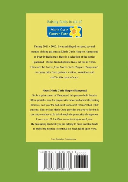 During 2011 - 2012, the writer was privileged to spend several months visiting patients at Marie Curie Hospice Hampstead as Poet-in-Residence. Here is a selection of the stories she gathered - stories from disparate lives, set out as verse. These are the Voices of Marie Curie Hospice Hampstead - everyday tales from patients, visitors, volunteers and staff in this oasis of care.