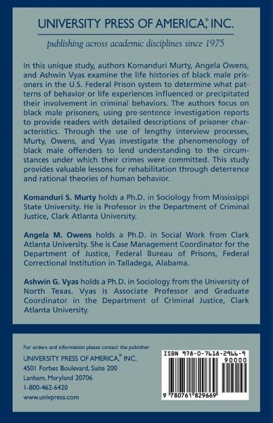 In this unique study, authors Komanduri Murty, Angela Owens, and Ashwin Vyas examine the life histories of Black male prisoners in the U.S. Federal Prison system, to determine what patterns of behavior or life experiences influenced or precipitated their involvement in criminal behavior. The authors focus on Black male prisoners, using pre-sentence investigation reports to provide readers with detailed descriptions of prisoner characteristics.
