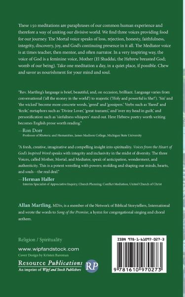 These 150 meditations are paraphrases of our common human experience and therefore a way of uniting our divisive world. We find three voices providing food for our journey. The Mortal voice speaks of loss, rejection, honesty, faithfulness, integrity, discovery, joy, and God's continuing presence in it all. The Mediator voice is at times teacher, then mentor, and often narrator. In a very inspiring way, the voice of God is a feminine voice, Mother (El Shaddai, the Hebrew breasted God; womb of our being). Take one meditation a day, in a quiet place, if possible. Chew and savor as nourishment for your mind and soul.