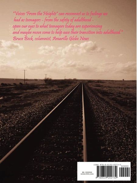 Voices from the Heights is an anthology of works from at-risk students at innovative, award-winning North Heights Alternative School in Amarillo, Texas. The stories are often gritty & personal but these young writers are courageous, creative & talented. Read more about this book and school in this article: http://www.amarillo.com/stories/050408/fea_10069474.shtml Bruce Beck, Am Globe News: Many of the writers in "Voices" found a safe haven at North Heights Alternative School and are not shy about telling how they ended up there and their amazement at what they found when they arrived - a caring, nonjudgmental staff that looks beyond the surface to the potential that lies beneath. The children whose writings populate "Voices" are young single mothers, children of single-parent households, liberals, conservatives, idealists, cynics, pro-President Bushies, anti-President Bushies, drug-users, former drug-users, friends of drug-users, the children of drug-users. They are us.