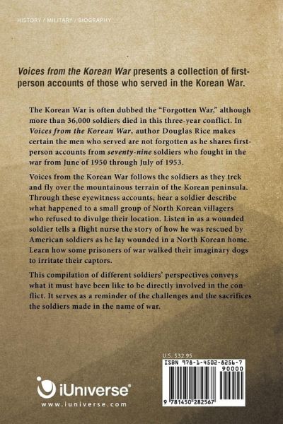 Voices from the Korean War presents a collection of first-person accounts of those who served in the Korean War. The Korean War is often dubbed the "Forgotten War," although more than 36,000 soldiers died in this three-year conflict. In Voices from the Korean War, author Douglas Rice makes certain the men who served are not forgotten as he shares first-person accounts from seventy-nine soldiers who fought in the war from June of 1950 through July of 1953. Voices from the Korean War follows the soldiers as they trek and fly over the mountainous terrain of the Korean peninsula. Through these eyewitness accounts, hear a soldier describe what happened to a small group of North Korean villagers who refused to divulge their location. Listen in as a wounded soldier tells a flight nurse the story of how he was rescued by American soldiers as he lay wounded in a North Korean home. Learn how some prisoners of war walked their imaginary dogs to irritate their captors. This compilation of different soldiers' perspectives conveys what it must have been like to be directly involved in the conflict. It serves as a reminder of the challenges and the sacrifices the soldiers made in the name of war.