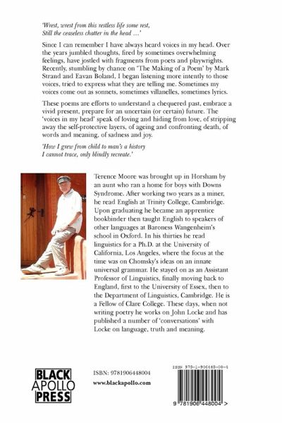 Voices in my Head by Terence Moore is an accessible and moving selection of sonnets, villanelles and lyrics charting one man's experience of living and loving, of hiding and revealing self, of communicating and not, of ageing and nudging up to death. Terence Moore was brought up in Horsham. After two years as a miner, he read English at Trinity College, Cambridge. After graduating he became an apprentice bookbinder then taught English to speakers of other languages at Baroness Wangenheim's school in Oxford. In his thirties he read linguistics for a Ph.D. at UCLA, where the focus was on Chomsky's ideas on universal grammar. He stayed on as an Assistant Professor of Linguistics, then returned to England, to Essex University, then the Department of Linguistics, Cambridge. He is a Fellow of Clare College. When not writing poetry he works on John Locke and has published a number of 'conversations' with Locke on language, truth and meaning.