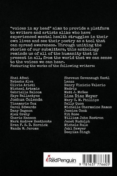 "voices in my head" aims to provide a platform to writers and artists alike who have experienced mental health struggles in their own lives and see their poetry as a tool that can spread awareness. Through uniting the stories of our submitters, this anthology reminds us of all of the humanity that is present in all, from the world that we can sense to the voices we can hear. Featuring the works of the following writers: Shai Afsai Natasha Alva Olivia Arieti Michael Artemis Gabriella Balcom Skye Ballantyne Joshua Colenda Tinamarie Cox Carol Edwards Dany Gagnon Alex Grehy Cherie Hanson Mark Andrew Heathcote Eran F. S. D. Hornick Wanda W. Jerome Shevaun Cavanaugh Kastl Lanzz Henry Vinicio Valerio Madriz Matt J. McGee Lisa Diaz Meyer Mary C. M. Phillips Sally Quon Michelle Chermaine Ramos Jessica Cook Kit Rose William John Rostron Janet Rudolph Michele Rule Jaki Sawyer Deepika Singh