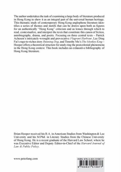 The author undertakes the task of examining a large body of literature produced in Hong Kong to show it as an integral part of the universal human heritage. This thematic study of contemporary Hong Kong anglophone literature identifies a series of themes and motifs that can be drawn upon both as figures for an authentically «Hong Kong» criticism and as lenses through which to read, contextualize, and interpret the texts that constitute this canon of fiction, autobiography, drama, and poetry. Focusing on three central texts - Patrick Acheson's intricately-wrought and provocative Flagrant Harbour, Lee Ding Fai's rags-to-riches story Running Dog, and Timothy Mo's The Monkey King - Hooper offers a theoretical structure for analyzing the postcolonial phenomena in the Hong Kong context. This book includes an exhaustive bibliography of Hong Kong literature.