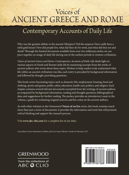 Collecting documents culled from the writings of ancient Greek and Roman authors, this book provides a glimpse of what life was like in ancient times and illustrates the relevance of these long-ago civilizations to modern life. Voices of Ancient Greece and Rome: Contemporary Accounts of Daily Life sheds light on various aspects of Greek and Roman daily life by examining excerpts from the works of ancient authors who wrote about these topics. Written to help readers truly understand what life within an ancient civilization was like, each entry is preceded by background information and followed by thought-provoking questions. This book covers fascinating topics such as domestic life, employment, housing, food and clothing, sports and games, public safety, education, health care, politics, and religion. Each chapter contains several relevant documents excerpted from the writings of ancient authors accompanied by background information, reading and thought questions, bibliographical data, and suggestions for further reading. An introductory essay to the volume, a guide for evaluating original sources, and bio-notes on the ancient authors are also included. As with other volumes in the Greenwood Voices of an Era series, this book contains much more than just a series of documents: it provides the information and tools that will promote critical thinking and support the research process.