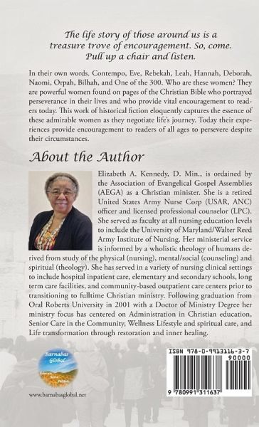 I started reading your book and was completely blown away. Your book is unlike anything I have ever read.Your sanctified imagination is operating at a whole different dimension!!!You are beyond creative and have given me the freedom to use mine as wellThank you for blessing me with your book!Blessings,Evangelist Slusher In their own words Contempo, Eve, Rebekah, Leah, Hannah, Deborah, Naomi, Orpah, Bilhah, and One of the 300. Who are these women? What do they have in common? They are powerful women found on the pages of the Christian Bible who portrayed perseverance in their respective lives…mehr