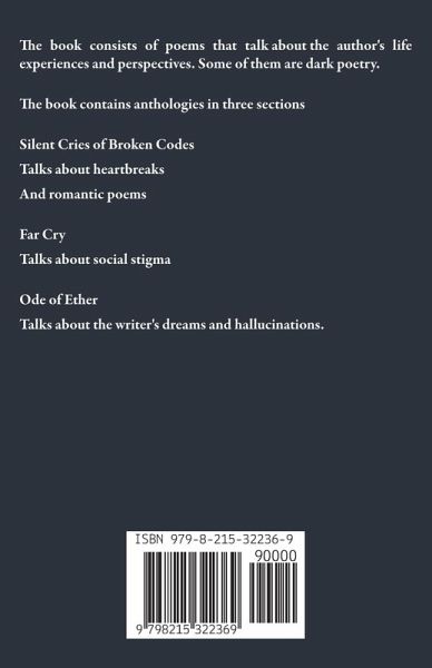 The book consists of poems that talk about the author's life experiences and perspectives. Some of them are dark poetry. The book contains anthologies in three sections Silent Cries of Broken Codes Talks about heartbreaks And romantic poems Far Cry Talks about social stigma Ode of Ether Talks about the writer's dreams and hallucinations.