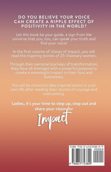Do you believe your voice can create a ripple effect of positivity in the world? Let this book be your guide, a sign from the universe that you can speak your truth and find your voice! In the first volume of Voices of Impact, you will read the inspiring stories of 25 Visionary women. Through their personal journeys of transformation, they have all emerged with a powerful purpose to create a meaningful impact in their lives and businesses. You will be moved to take inspired action in your own life after reading their stories of courage and overcoming. Ladies, it's your time to step up, step out and share your vision for impact! Complied by best-selling author and publisher, Melanie Wood. Featuring: Colleen Dwyer Jaime Lee Foord Dr Dee Hacking Chrissy Harris Donna Kirkland Faye Lawrence Christine Lennon Karen Macvicar Cattalia Lee Montgomery Jodi Porteous Dori Stewart Sharon L Bech Katie Chapman Dr Carolyn Daniels Najma Khan Natalie Lewis Alissa Meechan Kären Moroney Susie Moore Lorrayne Robbinz Dr Libby Roesner Vicki Tate Danni Vee Camilla Ward Rhonda Whiteley