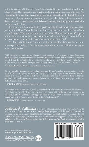 In the sixth century, St. Columba founded a retreat off the west coast of Scotland on the island of Iona. Here monastics and pilgrims could find healing and meet with God. For generations to come, Iona served as a focal point throughout the British Isles as a community of work, prayer, and solitude--a meeting place between heaven and earth. Saints and sinners were restored in this island sanctuary, inspiring great works of faith and great works of art. The poems in this volume depict vignettes of pilgrims at various stages on their journey toward Iona. The author, an American expatriate, composed these poems both as a reflection of his own experiences in the British Isles and as votive offerings to prompt interior spiritual pilgrimage within the readers. It is through poetry, Fullman believes, that we, too, can rediscover ourselves and meet with God. For those who have ever left home, or felt estranged in their own home, these poems speak to the heart of displacement and dislocation--and of finding belonging in an unfamiliar land.