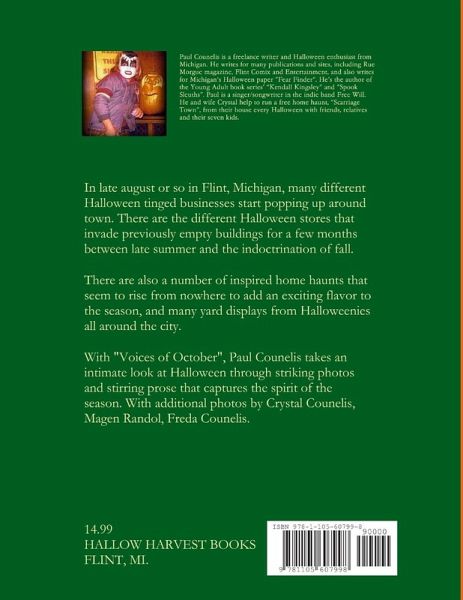 In late August or so in Flint, Michigan, many different Halloween tinged businesses, ideas and displays start popping up around town. There are the different Halloween stores that invade previously empty buildings for a few months between late summer and the indoctrination of fall. There are also a number of inspired haunts that seem to rise from nowhere to add an exciting flavor to the season, and many yard displays from Halloweenies all around the city. It's not entirely clear why Halloween is such a big deal in cities like Flint, except for perhaps the escapism aspect of it all, and the fact that Halloween can be a relatively cheap holiday to take part in. "Voices of October" is an intimate, look at Halloween through striking photos and stirring prose that captures the spirit and magic of the season. With additional photos by Freda Counelis, Magen Randol, Crystal Counelis. BLACK AND WHITE VERSION with added photos and prose!