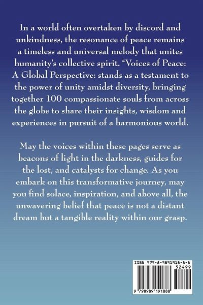 In a world often overtaken by discord and unkindness, the resonance of peace remains a timeless and universal melody that unites humanity's collective spirit. "Voices of Peace: A Global Perspective: stands as a testament to the power of unity amidst diversity, bringing together 100 compassionate souls from across the globe to share their insights, wisdom and experiences in pursuit of a harmonious world. May the voices within these pages serve as beacons of light in the darkness, guides for the lost, and catalysts for change. As you embark on this transformative journey, may you find solace, inspiration, and above all, the unwavering belief that peace is not a distant dream but a tangible reality within our grasp.