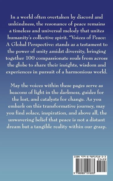 In a world often overtaken by discord and unkindness, the resonance of peace remains a timeless and universal melody that unites humanity's collective spirit. "Voices of Peace: A Global Perspective: stands as a testament to the power of unity amidst diversity, bringing together 100 compassionate souls from across the globe to share their insights, wisdom and experiences in pursuit of a harmonious world. May the voices within these pages serve as beacons of light in the darkness, guides for the lost, and catalysts for change. As you embark on this transformative journey, may you find solace, inspiration, and above all, the unwavering belief that peace is not a distant dream but a tangible reality within our grasp. Contributors: Dr. Aderomoke Martins (h.c.) Alescia Andrews Alex Ann Rathjen Alice Del Rey Dr. Althenia Morris Amb. Dr. (h.c) Angela Covany Amb. Dr. (h.c.) AnGele M. Cade Dr. Angelica Benavides Amb. Dr. (h.c.) Angeline Benjamin Amb. Dr. (h.c.) Avic Ronquillo-DeCastro Amb. Belinda Foster Lady Beverly and Dameon Greene Carmelita Pittman Amb. Dr. (h.c.) Carol Liege Caroline Kyung Ha Kim Professor Dr. Caroline Makaka Amb. Charles Hai Nguyen Amb. Dr. Charmaine Summers (h.c.) Dr. Chaudhry Masood Mahmood Bhalli Amb. Dr. (h.c.) Chebra Dorsey (Ochea) Amb. Dr. Cheri Reynolds (h.c.) Amb. Dr. Cherilyn Lee Amb. Reverend Dr. Christine Park, D.D. Connie Mosher Crystal Perez Dana Green Darlene Hawley Amb. Dr. Dawn Anderson, DHL Amb. Dr. (h.c.) Debbie Love Deirdre Selby Dr. (h.c.) Dharlene Marie Fahl Di Carter Dr. (h.c.) Diana Londyn Amb. Donna Weber Amb. Dr. (h.c.) Dorothy Wolons HRM Queen Eden Soriano Trinidad Amb. Dr. (h.c.) Elizabeth Mejia-Celis Dr. (h.c.) Ellen Bitters-Archer HRM King Emir Haiyawi Gail Martin Amb. Drs. Glenn and Madeline Plate, (h.c.) Amb. Hanna Carter Holly Porter Dr. Imambay Kamara Jackie Aponte Jackie Phillips, M.S. Jayne Jorden-Gavin Amb. Jean Olexa Dr. (h.c.) Jeannette LeHoullier Amb. Jennifer Jrock Blake Amb. Jessica Smith Amb. Dr. (h.c.) Joan Wakeland Amb. John Connor Joy Ruffen Julie Brown, HHP, CPT Dr. Juliet Joseph Jurnie Hughes Kae Schreiber Dr. Katherine Wichmann Zacharias Dr. (h.c.) Kaye Sheffield Kimberle Smith Austin Dr. "Doula" Lakeysha Mattis (h.c.) Amb. Dr. (h.c.) Latasha Fennell Dr. Leisa Reid Lisa Brugger Dr. (h.c) Lisa Ray Lizzy Drew Lupe Johnson Amb. Dr. Marcy Decato Marneen Lynne Fields Martha Ettinghausen Mary Aurtrey Amb. Dr. (h.c.) Michelle Lewis Coach Dr. (h.c.) Mikki St. Germain Minh Dannerstedt, Ph.D. Amb. Dr. (h.c.) Nanciann Horvath Nancy Wright Nanette Meneses Ballidis Narkeita Motaabbed Drs. Nick and Dana Haselum Amb. Nicole Farrell Amb. Dr. (h.c.) Omenesa Oruma - Akomolafe Pamela Moffat H.E. Ambassador Patricia Y. Oliver H.E. Professor Dr. Pauline Long Amb. Dr. (h.c.) Randi Ward Randy Grove Amb. Dr. (h.c.) Raven Hilden Amb. Raziel F. Arcega Rima Aboulhosen Lady Amb. Dr. (h.c.) Robbie Motter Dr. (h.c.) Sara M. Lypps, MBA Dr. (h.c.) Suku Moyo MacKenzie Amb. Dr. (h.c.) Susie Mierzwik H.E. Amb. Dr. Tomesha D. Walker (h.c.), MDip, MCGI, CDKA, LCCE, CD (DONA) Dr. Tylisha A. Julienne Dr. Verlaine Crawford Amb. Dr. (h.c.) Violet Williams Dr. (h.c.) Virginia Earl Amb. Dr. (h.c.) Zulmara Maria Cline