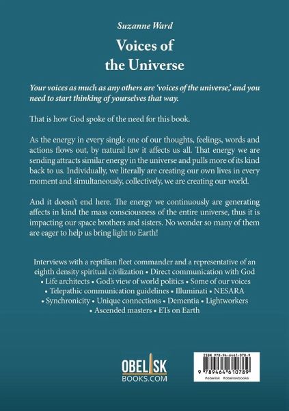 Your voices as much as any others are 'voices of the universe,' and you need to start thinking of yourselves that way. That is how God spoke of the need for this book. As the energy in every single one of our thoughts, feelings, words and actions flows out, by natural law it affects us all. That energy we are sending attracts similar energy in the universe and pulls more of its kind back to us. Individually, we literally are creating our own lives in every moment and simultaneously, collectively, we are creating our world. And it doesn't end here. The energy we continuously are generating affects in kind the mass consciousness of the entire universe, thus it is impacting our space brothers and sisters. No wonder so many of them are eager to help us bring light to Earth! Interviews with a reptilian fleet commander and a representative of an eighth density spiritual civilization ¿ Direct communication with God ¿ Life architects ¿ God's view of world politics ¿ Some of our voices ¿ Telepathic communication guidelines ¿ Illuminati ¿ NESARA ¿ Synchronicity ¿ Unique connections ¿ Dementia ¿ Lightworkers ¿ Ascended masters ¿ ETs on Earth