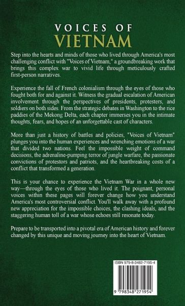 Step into the hearts and minds of those who lived through America's most challenging conflict with "Voices of Vietnam," a groundbreaking work that brings this complex war to vivid life through meticulously crafted first-person narratives. Experience the fall of French colonialism through the eyes of those who fought both for and against it. Witness the gradual escalation of American involvement through the perspectives of presidents, protesters, and soldiers on both sides. From the strategic debates in Washington to the rice paddies of the Mekong Delta, each chapter immerses you in the intimate thoughts, fears, and hopes of an unforgettable cast of characters. More than just a history of battles and policies, "Voices of Vietnam" plunges you into the human experiences and wrenching emotions of a war that divided two nations. Feel the impossible weight of command decisions, the adrenaline-pumping terror of jungle warfare, the passionate convictions of protestors and patriots, and the heartbreaking costs of a conflict that transformed a generation. This is your chance to experience the Vietnam War in a whole new way-through the eyes of those who lived it. The poignant, personal voices within these pages will forever change how you understand America's most controversial conflict. You'll walk away with a profound new appreciation for the impossible choices, the clashing ideals, and the staggering human toll of a war whose echoes still resonate today. Prepare to be transported into a pivotal era of American history and forever changed by this unique and moving journey into the heart of Vietnam.