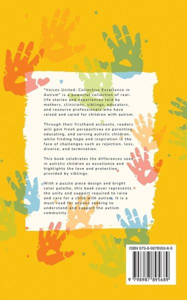 "Voices United: Collective Excellence in Autism" is a powerful collection of real-life stories and experiences told by mothers, clinicians, siblings, educators, and resource professionals who have raised and cared for children with autism. Through their firsthand accounts, readers will gain fresh perspectives on parenting, educating, and serving autistic children, while finding hope and inspiration in the face of challenges such as rejection, loss, divorce, and termination. This book celebrates the differences seen in autistic children as excellence and highlights the love and protection provided by siblings. With a puzzle piece design and bright color palette, this book cover represents the unity and support required to raise and care for a child with autism. This book is a must-read for anyone seeking to understand and support the autism community.