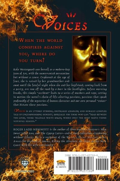 VOICES - A Gemstone Book (TRADE PAPERBACK), 250 pages. *** When the World Conspires against you, where do you turn? Kala Westergaard sees herself as a modern-day Joan of Arc, with the unwarranted persecution but without a cause. Orphaned at the age of four, she is raised by her grandmother and aunt until the fateful night when she and her boyfriend, coming back from a party, are run off the road by a deer in the headlights. Before morning breaks, this simple "accident" leads to a series of murders and rape, setting in motion the novel's chain of life-altering passions, passions that speak profoundly of the mysteries of human character and our own personal "voices" that dictate those passions. *** VOICES is an utterly stirring, erotically charged, and morally complex tale of uncompromising honesty, especially for those who can "read between the lines, those telltale white spaces, where only the most naive think nothing resides."